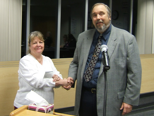 Martinez Board of Education Meeting January 10, 2011. Alhambra Alumni presents their first donation to the future alumni. Shown: Vicki Gordon, Board President and David Rich, Administrator of AlhambraAlumni.org
