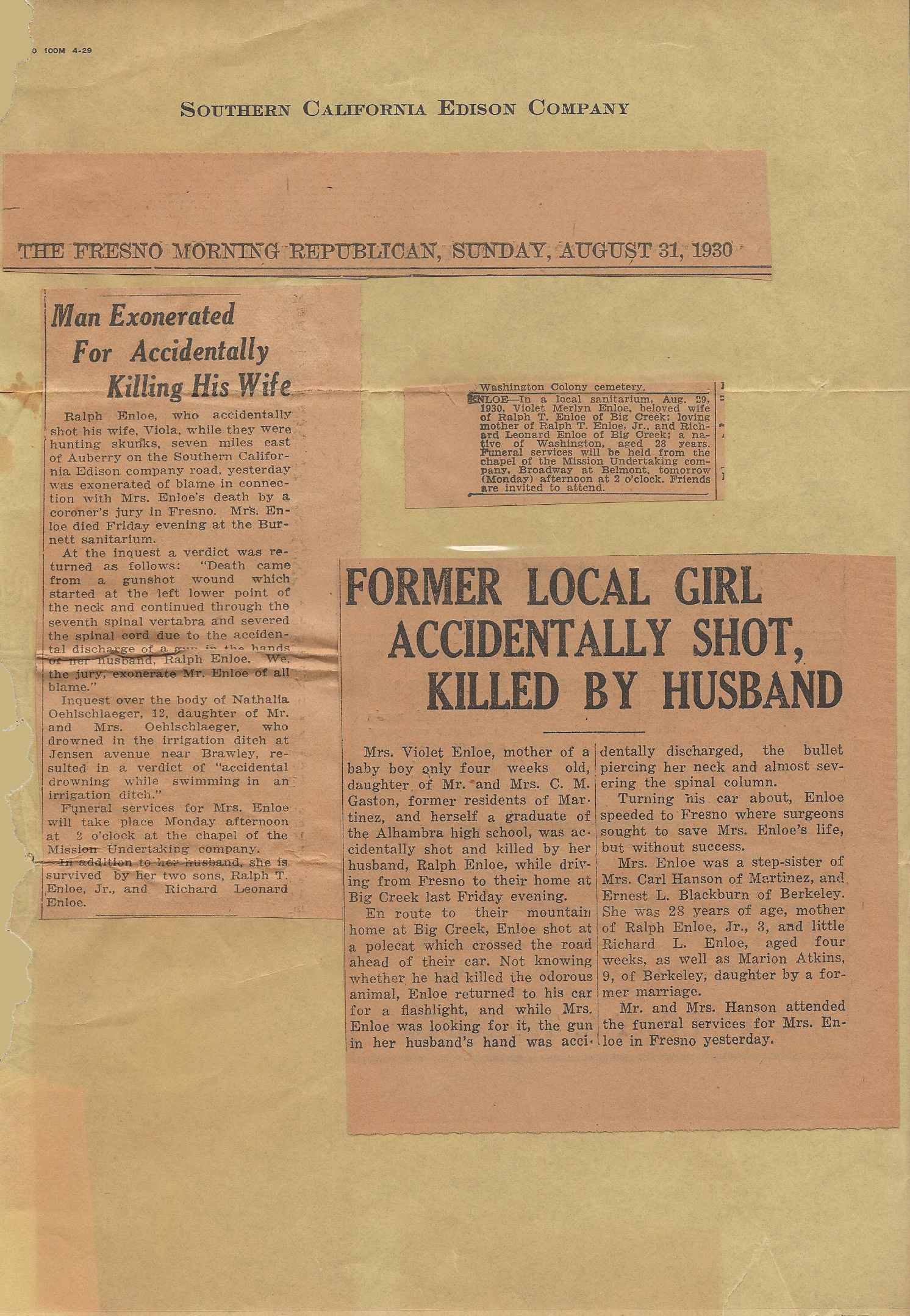 Mrs. Violet Enloe, mother of a baby boy only four weeks old, daughter of Mr. and Mrs. C.M. Gaston, former residents of Martinez, and herself a graduate of Alhambra High School, was accidentally shot and killed by her husband, Ralph Enloe, while driving from Fresno to their home at Big Creek last Friday evening.